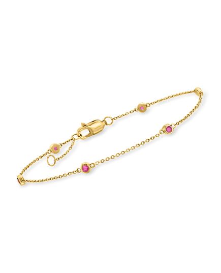 With a commitment to quality and affordability, Ross-Simons presents timeless jewelry for the modern woman. RS Pure. Modern designs that complete your outfit and complement your personality. When your stack needs a pop of color, add this chic bracelet to the mix! It features 0.20 ct. t.w. ruby rounds stationed along a cable chain in polished 14kt yellow gold. Includes a 1/2" extender. Lobster clasp, ruby station bracelet. Each Ross-Simons item arrives in a fine jewelry presentation box. Shop Ross-Simons jewelry risk-free as all items include a 30-day, 100% money-back guarantee.Stone InformationGem Type 1 - RubyStone Cut 1 - Good-CutStone Color 1 - RedStone Clarity 1 - RedStone Shape 1 - Round-ShapeStone Creation Method 1 - NaturalStone Treatment Method 1 - Heat-TreatedStone Weight 1 - 0.20 CaratsNumber Of Stones 1 - 6