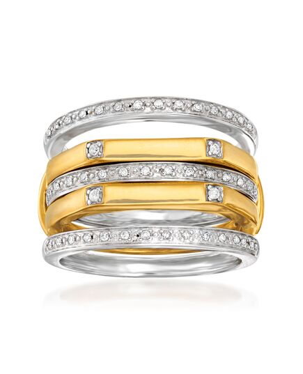 A trusted jeweler in 1952, Ross-Simons is dedicated to quality and value. This stackable ring set opens up a variety of style options. Includes three diamond sterling silver bands and a diamond 18kt gold over sterling ring guard, designed to fit a band in the center. Total diamond weight is 0.15 carats. Sterling silver and 18kt yellow gold over sterling silver rings. Each Ross-Simons item arrives in a fine jewelry presentation box. Shop Ross-Simons jewelry risk-free as all items include a 30-day, 100% money-back guarantee.Stone InformationGem Type 1 - DiamondStone Cut 1 - Good-CutStone Color 1 - H-IStone Clarity 1 - I2Stone Shape 1 - Round-ShapeStone Creation Method 1 - NaturalStone Treatment Method 1 - Not-TreatedStone Weight 1 - 0.15 CaratsNumber Of Stones 1 - 47