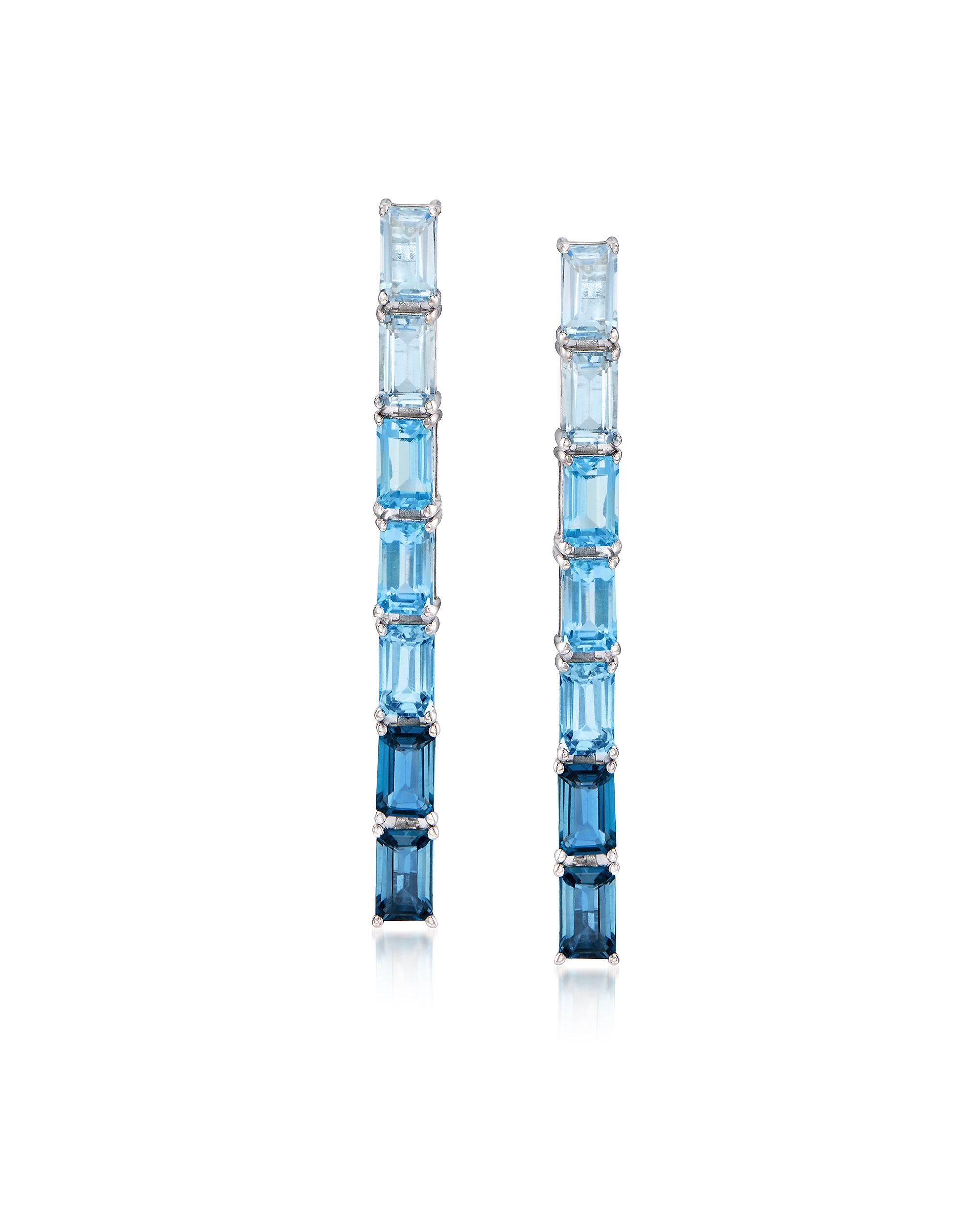 With a commitment to quality and affordability, Ross-Simons presents timeless jewelry for the modern woman. Take a dip into blue hues with these magnificent drop earrings. Fourteen emerald-cut sky, Swiss and London blue topaz gems, 4.00 ct. t.w., trail down in shades of blue from light to dark. Set in polished sterling silver. Hanging length is 1 1/2". Post/clutch, sky, Swiss and London blue topaz drop earrings. Each Ross-Simons item arrives in a fine jewelry presentation box. Shop Ross-Simons jewelry risk-free as all items include a 30-day, 100% money-back guarantee.Stone InformationGem Type 1 - TopazStone Cut 1 - Good-CutStone Color 1 - BlueStone Clarity 1 - BlueStone Shape 1 - Emerald-ShapeStone Creation Method 1 - NaturalStone Treatment Method 1 - Heat-Treated,IrradiatedStone Weight 1 - 1.90 CaratsNumber Of Stones 1 - 6Gem Type 2 - TopazStone Cut 2 - Good-CutStone Color 2 - BlueStone Clarity 2 - BlueStone Shape 2 - Emerald-ShapeStone Creation Method 2 - NaturalStone Treatment Method 2 - Heat-Treated,IrradiatedStone Weight 2 - 1.10 CaratsNumber Of Stones 2 - 4Gem Type 3 - TopazStone Cut 3 - Good-CutStone Color 3 - BlueStone Clarity 3 - BlueStone Shape 3 - Emerald-ShapeStone Creation Method 3 - NaturalStone Treatment Method 3 - Heat-Treated,IrradiatedStone Weight 3 - 1.00 CaratsNumber Of Stones 3 - 4