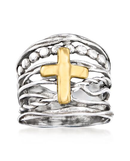 A top-rated jeweler since 1952, Ross-Simons travels the world to find high-quality styles at the best prices. Two-tone and oversized - double the trends in one ring! On multiple bands of textured and polished sterling silver, a bright 14kt yellow gold cross stands out. A faithful symbol meets an edgy style in this 3/4" wide ring. Two-tone cross ring. Each Ross-Simons item arrives in a fine jewelry presentation box. Shop Ross-Simons jewelry risk-free as all items include a 30-day, 100% money-back guarantee.