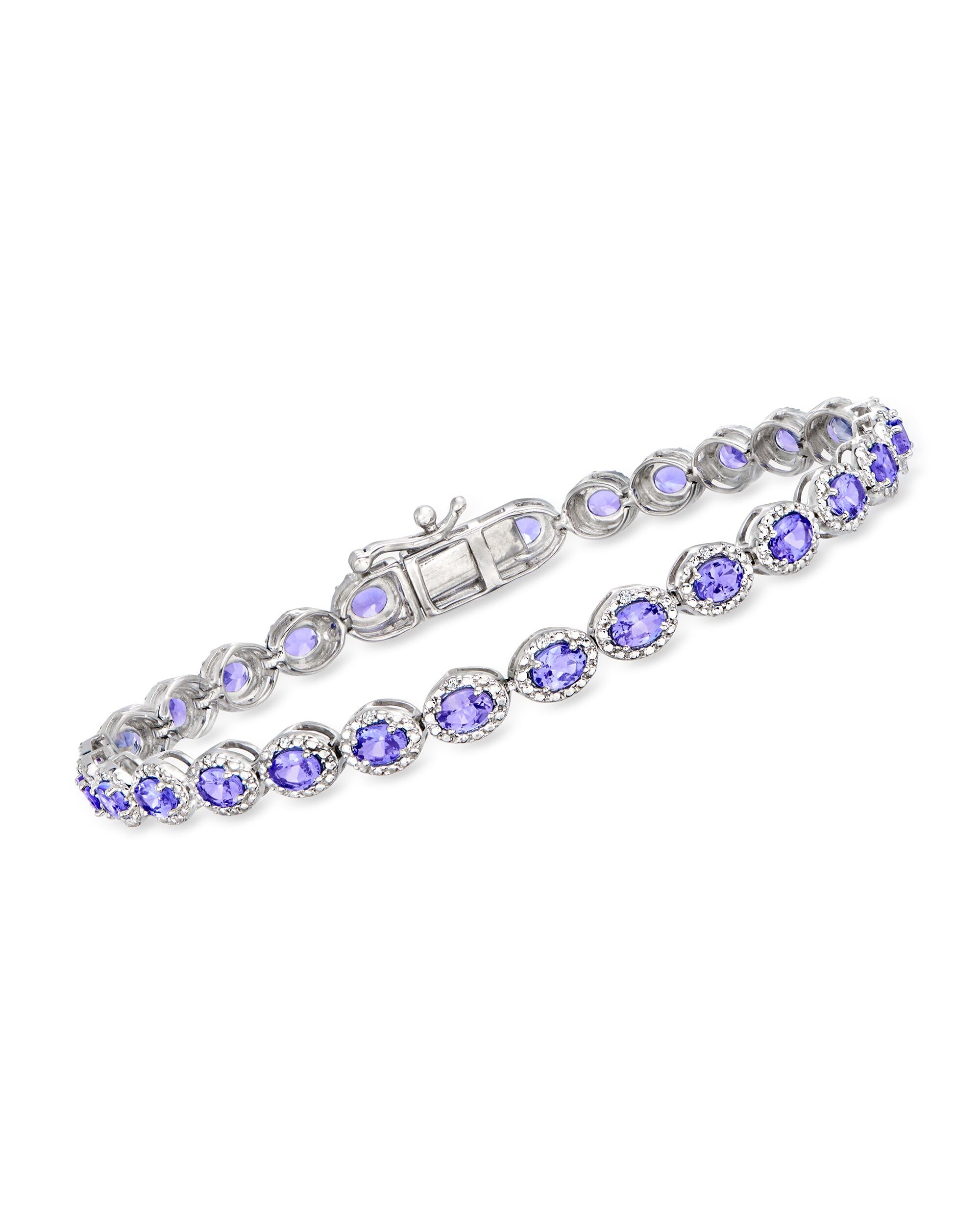 Ross-Simons is the authority on fashionable must-haves. There's just something breathtaking about the purple glow of tanzanite lit with diamonds. This stunning tennis bracelet features 5.00 ct. t.w. tanzanite ovals haloed by .10 ct. t.w. round diamonds in polished sterling silver. Wear it whenever you want to add a luxe touch to your day. Figure 8 safety. Box clasp, diamond and tanzanite tennis bracelet. Each Ross-Simons item arrives in a fine jewelry presentation box. Shop Ross-Simons jewelry risk-free as all items include a 30-day, 100% money-back guarantee.Stone InformationGem Type 1 - TanzaniteStone Cut 1 - Good-CutStone Color 1 - Violet-BlueStone Clarity 1 - Violet-BlueStone Shape 1 - Oval-ShapeStone Creation Method 1 - NaturalStone Treatment Method 1 - Heat-TreatedStone Weight 1 - 5.00-5.70 CaratsNumber Of Stones 1 - 28-32Gem Type 2 - DiamondStone Cut 2 - Good-CutStone Color 2 - H-IStone Clarity 2 - I2Stone Shape 2 - Round-ShapeStone Creation Method 2 - NaturalStone Treatment Method 2 - Not-TreatedStone Weight 2 - 0.10-0.11 CaratsNumber Of Stones 2 - 28-32
