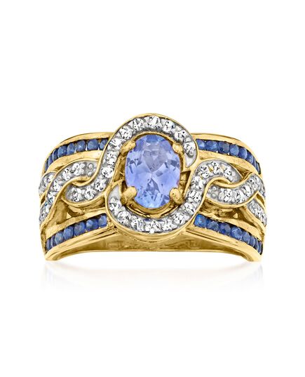 With a commitment to quality and affordability, Ross-Simons presents timeless jewelry for the modern woman. Spotlighting a vivid 0.80 carat oval tanzanite, this sophisticated ring presents icy swirls of .30 ct. t.w. white zircon rounds in white rhodium and top and bottom borders of .60 ct. t.w. round sapphires. Crafted in polished 18kt yellow gold over sterling silver with a touch of open-space elegance. 1/2" wide. White zircon, sapphire and tanzanite ring. Each Ross-Simons item arrives in a fine jewelry presentation box. Shop Ross-Simons jewelry risk-free as all items include a 30-day, 100% money-back guarantee.Stone InformationGem Type 1 - SapphireStone Cut 1 - Good-CutStone Color 1 - BlueStone Clarity 1 - BlueStone Shape 1 - Round-ShapeStone Creation Method 1 - NaturalStone Treatment Method 1 - HeatedStone Weight 1 - 0.60 CaratsNumber Of Stones 1 - 32Gem Type 2 - TanzaniteStone Cut 2 - Good-CutStone Color 2 - Violet-BlueStone Clarity 2 - Violet-BlueStone Shape 2 - Oval-ShapeStone Creation Method 2 - NaturalStone Treatment Method 2 - Heat-TreatedStone Weight 2 - 0.80 CaratsNumber Of Stones 2 - 1Gem Type 3 - ZirconStone Cut 3 - Good-CutStone Color 3 - WhiteStone Clarity 3 - WhiteStone Shape 3 - Round-ShapeStone Creation Method 3 - NaturalStone Treatment Method 3 - Heat-TreatedStone Weight 3 - 0.30 CaratsNumber Of Stones 3 - 48