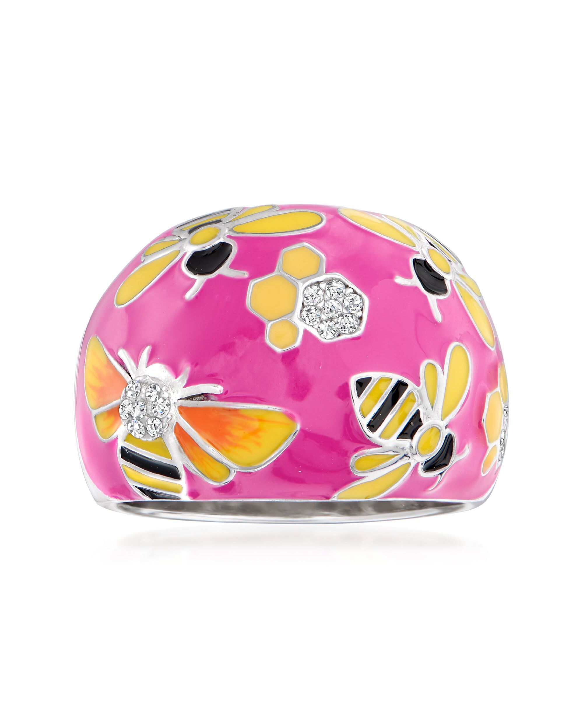 Ross-Simons is the authority on luxury classics. Springtime forever. Keep the happy spirit of the season all year long with this charming bumblebee ring, beautifully depicting the buzzy creatures in vivid pink, yellow, orange and black enamel, and sparkling with 0.10 ct. t.w. white topaz rounds in white rhodium. Set in polished sterling silver. 5/8" wide. Multicolored enamel and white topaz bumblebee ring. Each Ross-Simons item arrives in a fine jewelry presentation box. Shop Ross-Simons jewelry risk-free as all items include a 30-day, 100% money-back guarantee.Stone InformationGem Type 1 - TopazStone Cut 1 - Good-CutStone Color 1 - WhiteStone Clarity 1 - WhiteStone Shape 1 - Round-ShapeStone Creation Method 1 - NaturalStone Treatment Method 1 - Heat-Treated,IrradiatedStone Weight 1 - 0.10 CaratsNumber Of Stones 1 - 21