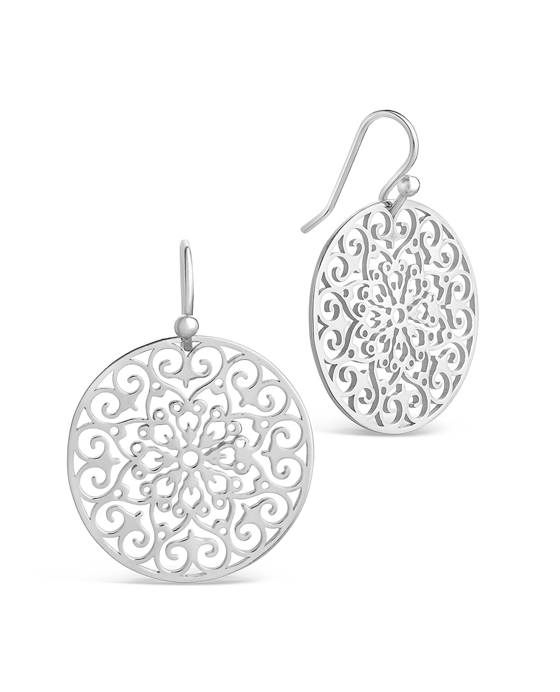 Want to add some delicate details to your look? This pair of round filigree dangle earrings are sure to do that. Choose from the gold, silver, or rose gold tones -- each of them is sure to impress, no matter where you wear these earrings. Materials - 14K gold vermeil, 14K rose gold vermeil, sterling silver Features - Approx. 1" disk, Lead Nickel free, fish hook post