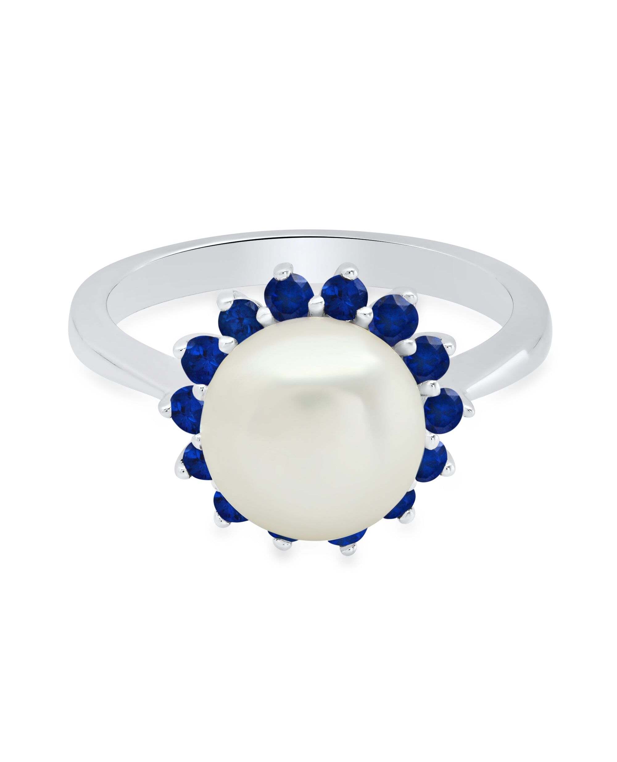 Sterling Silver 9MM Cultured Pearl and Created Blue Sapphire Ring Size 7