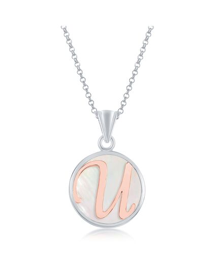 Sterling Silver MOP Pendant, Rose Gold Script Initial W/Chain