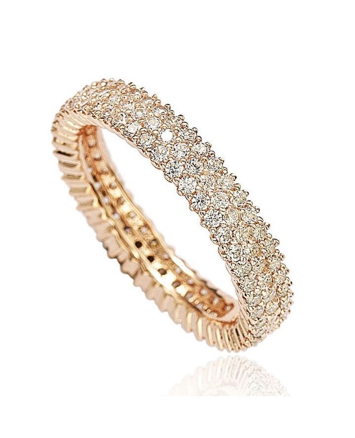 Show your eternal love and beauty with this timeless eternity band, featuring 130 round-cut white cubic zirconia gemstones, hand set in rose plated sterling silver with a unique Suzy Levian designer gallery. This is the perfect gift for any woman with a taste for fashion and a love for beauty. Whether it's a birthday, graduation, anniversary or just a simple 'I love you' gift, this is the perfect piece of jewelry to brighten up her day! This ring is designed by Suzy Levian with a message. By creating jewelry that is beautiful inside and out, Suzy Levian's message is revealed through a hidden stone set in the shank of this ring to empower women to discover their inner strength, power and beauty.