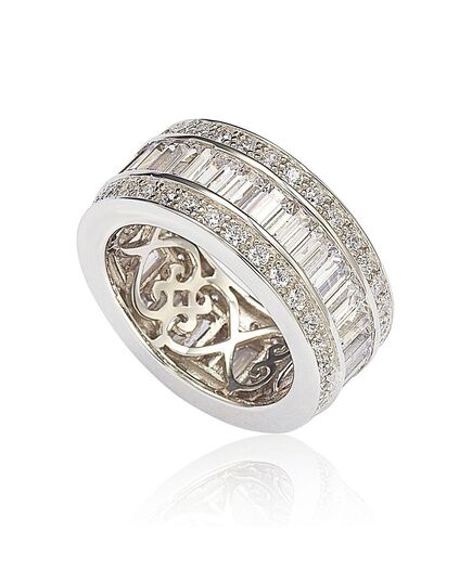 A symbol of love that will last an eternity. This ring is filled with neutral color and modern fashion, featuring white pave cubic zirconia set between two rows of channel-set white baguette cubic zirconia, hand set in 925 sterling silver. Surprise someone special in your life with this luxurious anniversary ring. White round and baguette-cut gemstones set in high-polish sterling silver setting create a ring that's not only strikingly gorgeous but reminds your special someone that your love lasts for all eternity! This ring is designed by Suzy Levian with a message. By creating jewelry that is beautiful inside and out, Suzy Levian's message is revealed through a hidden gemstone set in the shank of this ring to empower women to discover their inner strength, power and beauty. This ring has a closed under-gallery for comfort fit with a two-tone setting, highlighting Suzy Levian's SL logo. 'Together we can inspire the world to appreciate the diamond in ourselves.' - Suzy Levian