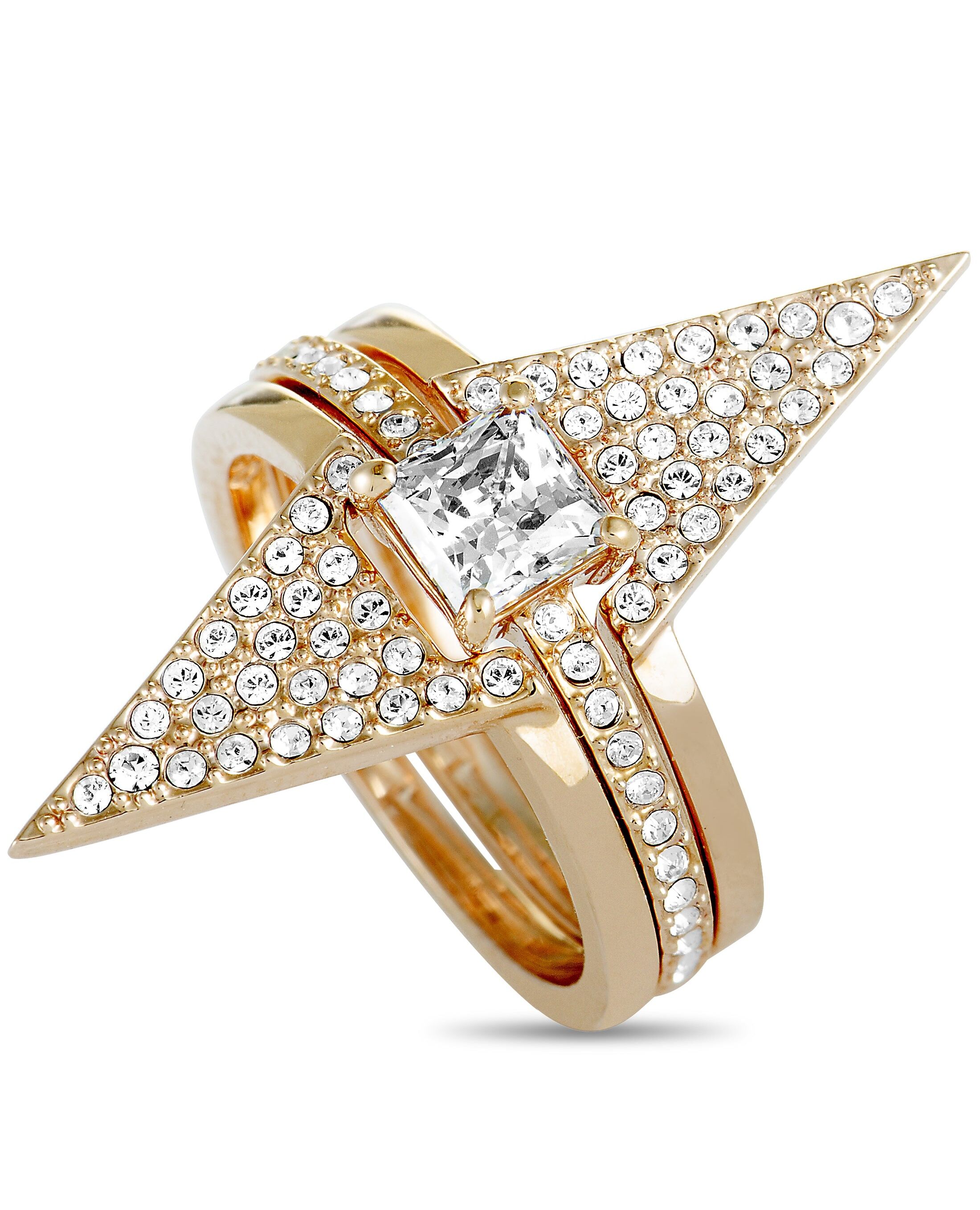 The “Funk” ring set by Swarovski includes three rose gold-plated rings that are embellished with crystals and weigh 5.4 grams in total. The set boasts band thickness of 5 mm and top height of 4 mm, while top dimensions measure 20 by 30 mm.Offered in brand new condition, this ring set includes the manufacturer’s box.